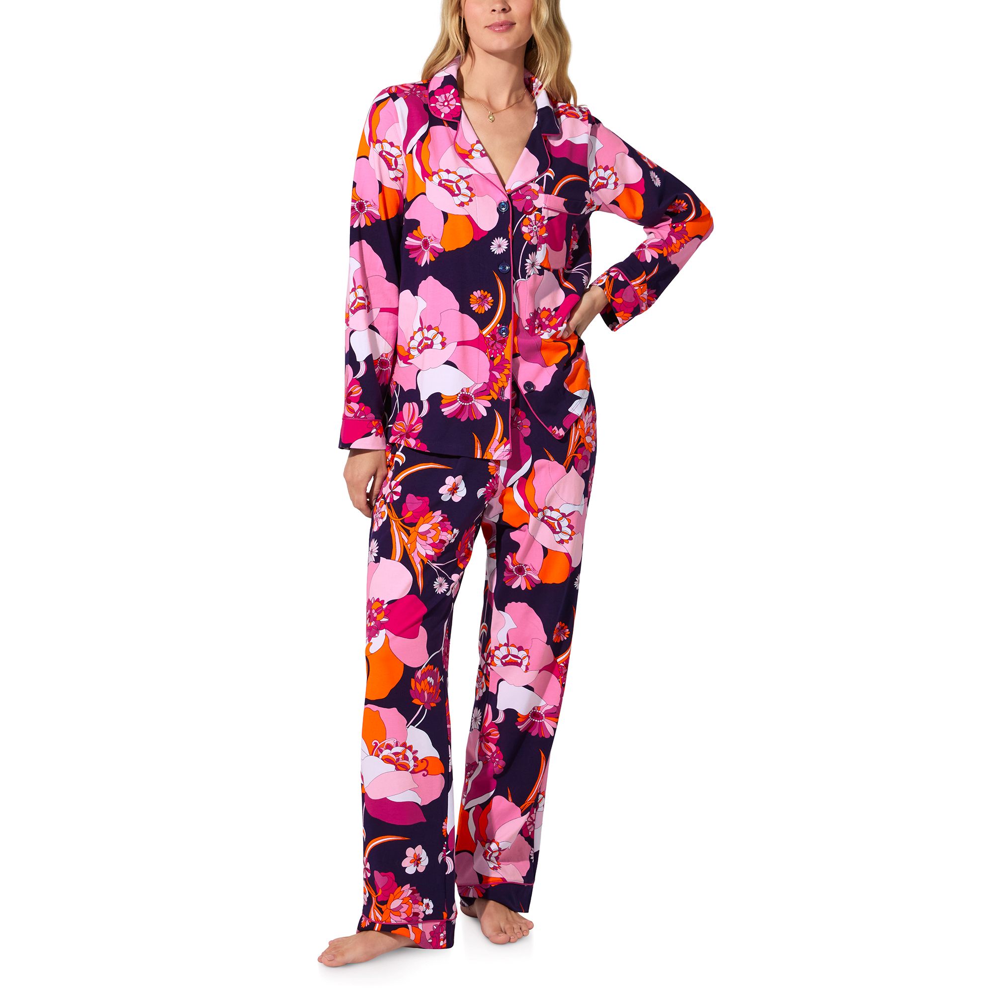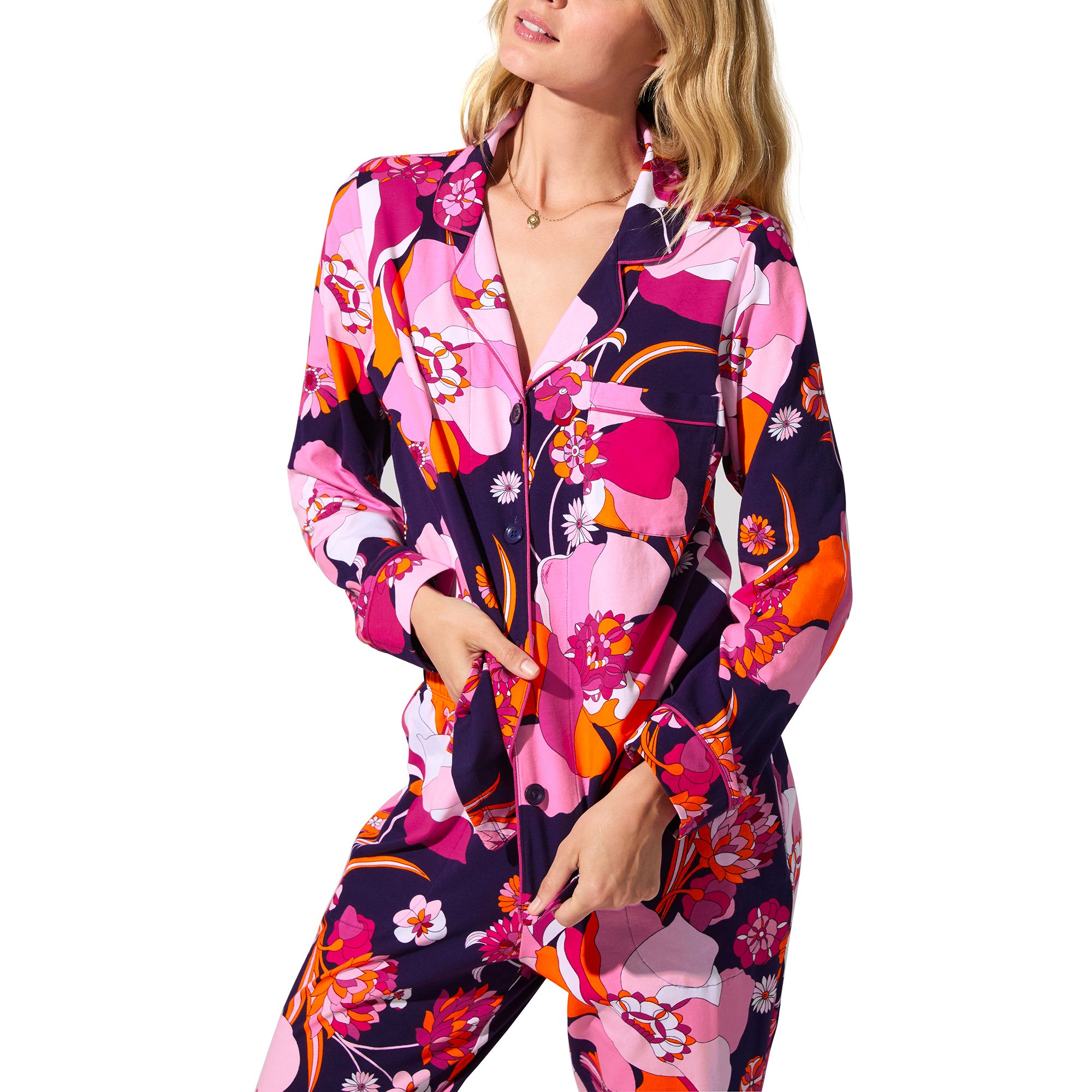 This Bedhead full-length PJ set wraps you in a medley of saturated florals with Trina Turk’s signature pop. Made from buttery-soft cotton jersey, it’s elegance with a playful twist. Women’s long sleeve stretch jersey pajamas—made with organic cotton provide stylish comfort. 4 buttons down centre front with a chest pocket. Contrast pink piping at collar and cuffs and a notch collar finish the look. Pants with an elastic waistband and side pockets in a buttery soft stretch jersey provide all-night comfort as they move with you make for easy wear day or night. BedHead Pajamas are made from ultrasoft, organically grown cotton certified as meeting the Global Organic Textile Standard (GOTS) and with eco-friendly materials and trims. These are a testament to their commitment to a forward-looking, sustainable approach to craftmanship and quality to ensure your best night’s sleep.