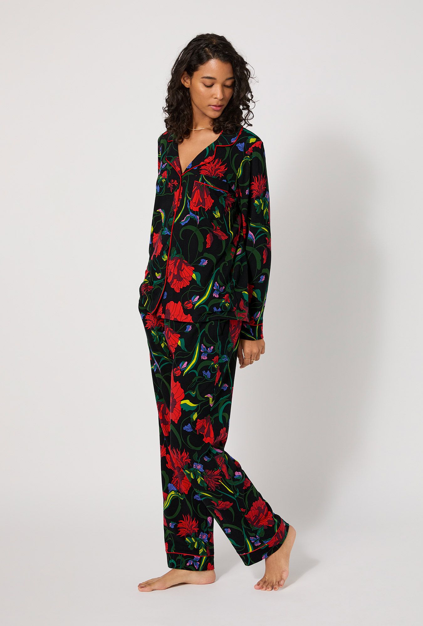 Bold blooms and soft cotton come together in this standout PJ set from our exclusive collab with Trina Turk. Featuring oversized florals in vivid reds and deep greens, the classic silhouette is finished with contrast piping, a notch collar, and full-length pants. Women’s long sleeve stretch jersey pajamas—made with organic cotton provide stylish comfort. 4 buttons down centre front with a chest pocket. Pants with an elastic waistband and side pockets in a buttery soft stretch jersey provide all-night comfort as they move with you make for easy wear day or night. BedHead Pajamas are made from ultrasoft, organically grown cotton certified as meeting the Global Organic Textile Standard (GOTS) and with eco-friendly materials and trims. These are a testament to their commitment to a forward-looking, sustainable approach to craftmanship and quality to ensure your best night’s sleep.