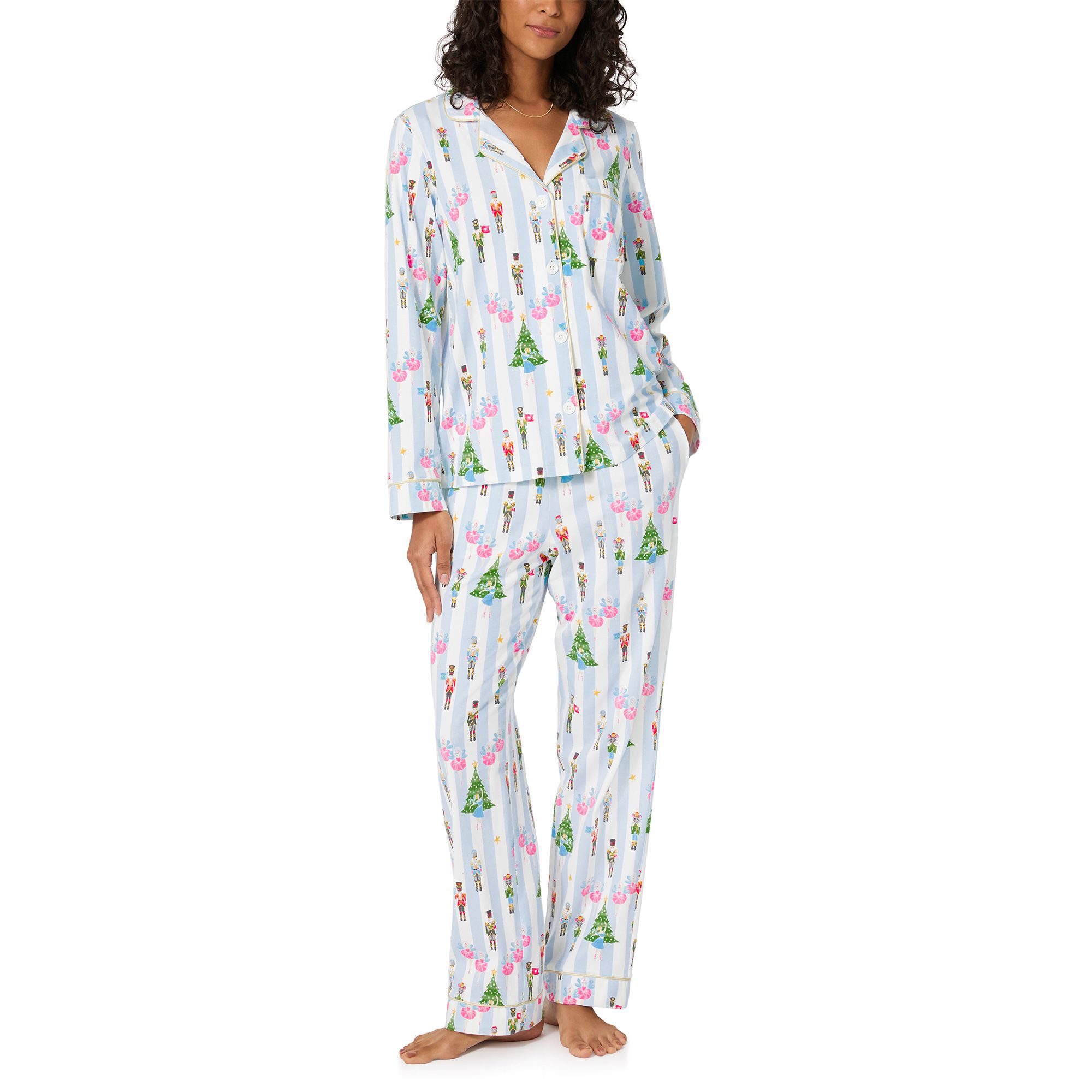 Women’s long sleeve stretch jersey pajamas—made with organic cotton provide stylish comfort. This full-length PJ set features a festive stripe print in soft pinks, blues, and creams—reminiscent of sugar plums and peppermint dreams. Crafted from breathable organic cotton jersey with a touch of stretch, it’s finished with a notch collar, gold glitter piping, and timeless tailoring. 4 buttons down centre front with a chest pocket. Pants with an elastic waistband and side pockets in a buttery soft stretch jersey provide all-night comfort as they move with you make for easy wear day or night. BedHead Pajamas are made from ultrasoft, organically grown cotton certified as meeting the Global Organic Textile Standard (GOTS) and with eco-friendly materials and trims. These are a testament to their commitment to a forward-looking, sustainable approach to craftmanship and quality to ensure your best night’s sleep.