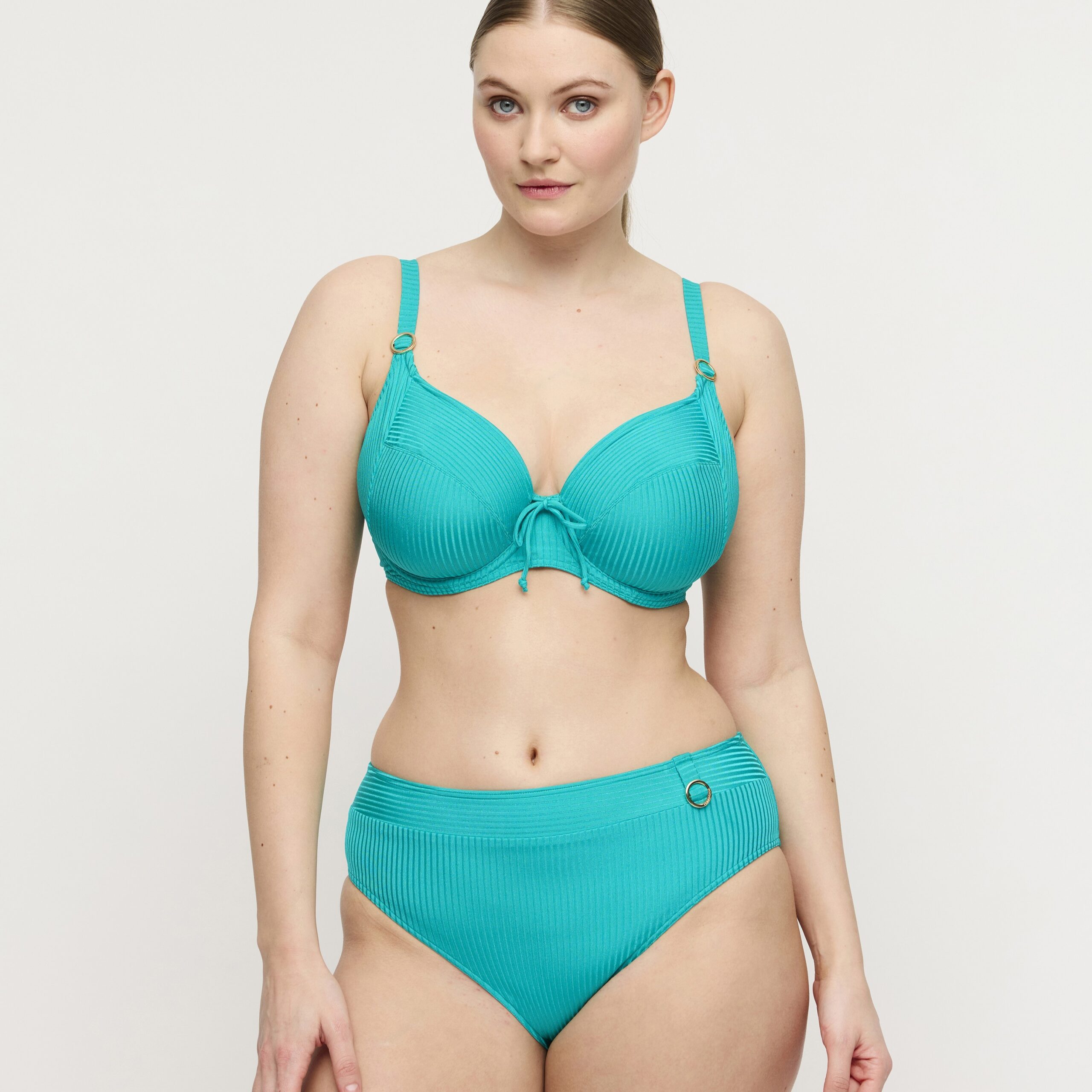 Prima Donna Delray stylish underwire bikini top with full cups in a trendy ribbed fabric.  A three-piece bra construction on the inside for full bust support. Adjustable straps that can be worn over the shoulders or haltered around the neck. On-trend and flattering in green and infinitely versatile in stylish black,