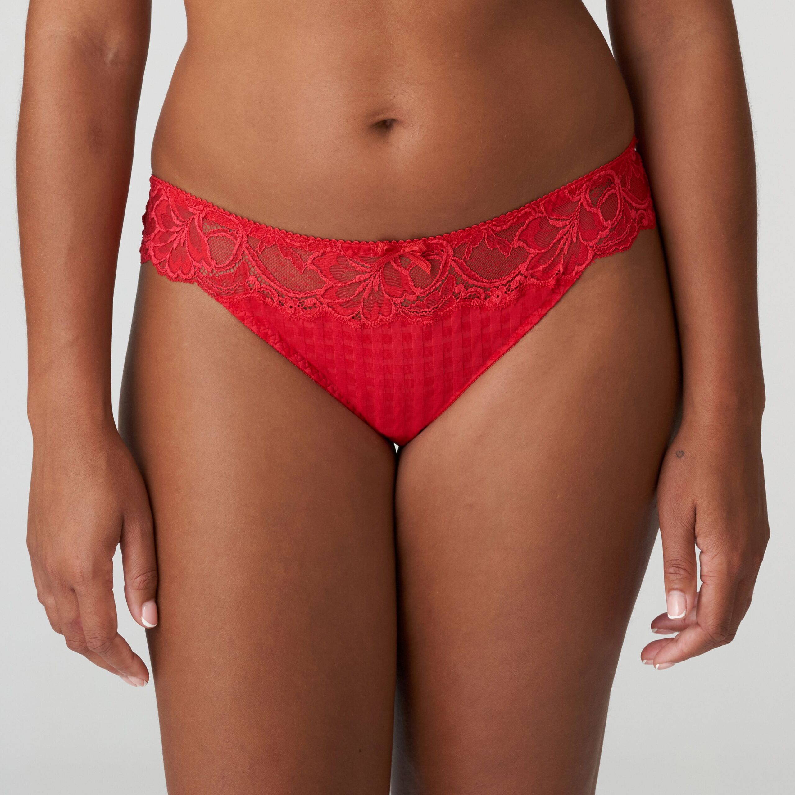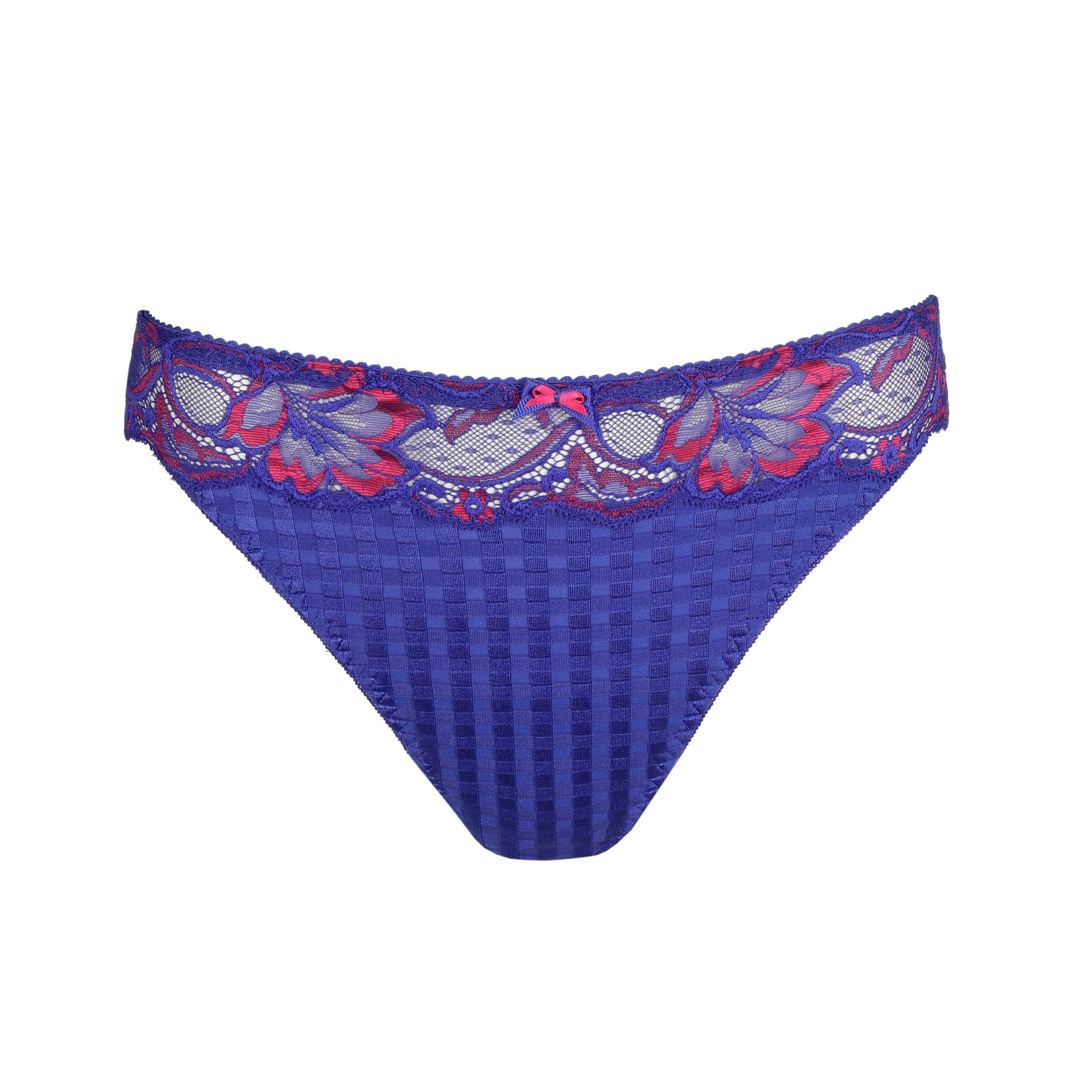 Prima Donna Madison thong style 0662125 is available in nude, white, ivory, red, black and Blueberry Kiss for fall in sizes S to 2XL.