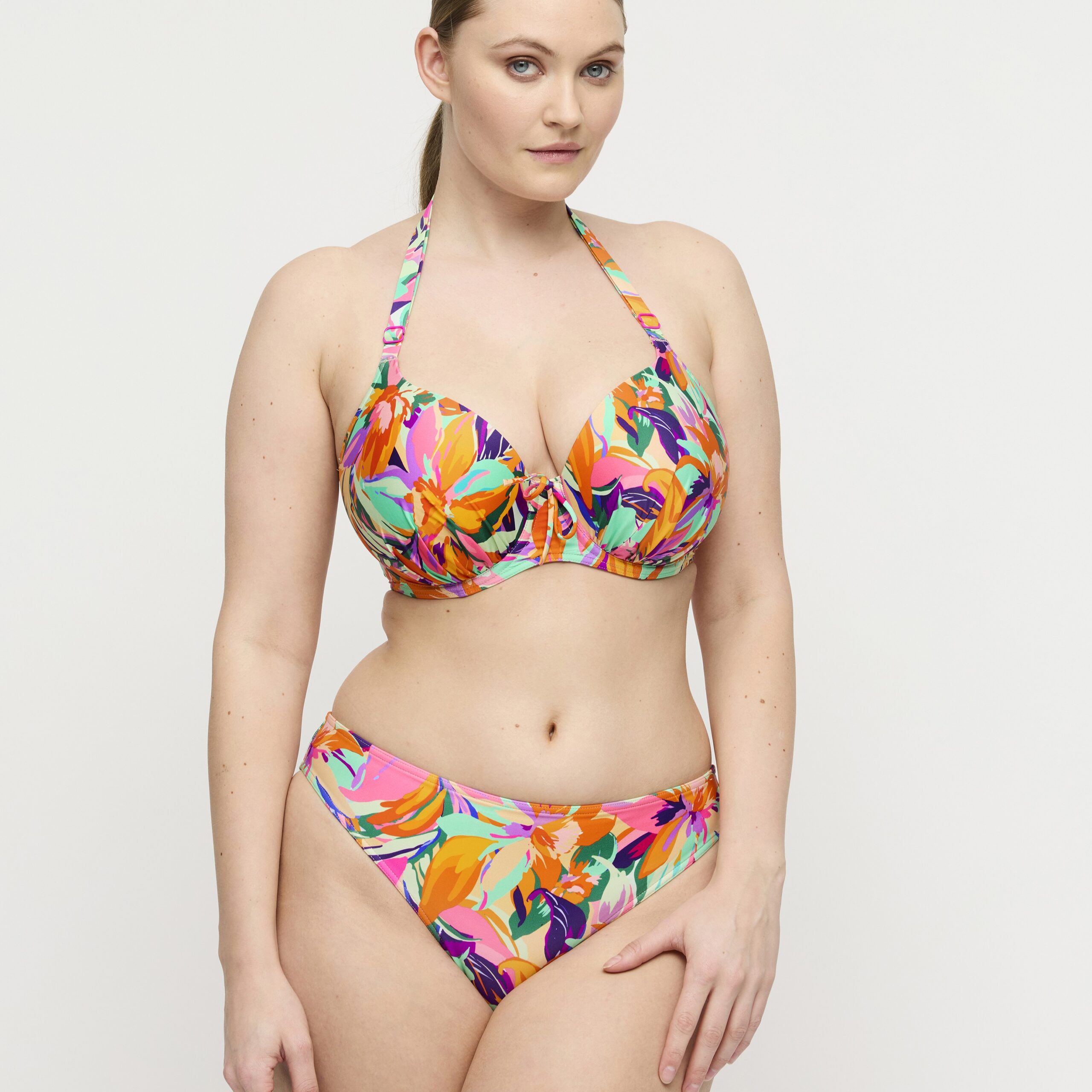 Prima Donna Varadeo trendy bikini top with a full support underwire cup in a cool tropical print. The multiway straps can be worn over the shoulders or around the neck halter style. Padded heart-shaped top that enhances your cleavage beautifully. Tropical vibes and fabulous fits for ultimate confidence